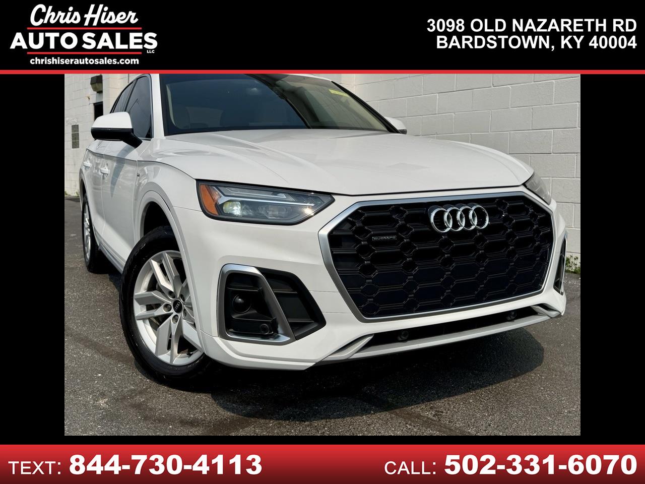 Chris Hiser Auto Sales is proud to present you with another True Market Priced Pre-Owned Vehicle. This 2022 Audi Q5 45 S line Premium is loaded with the following Factory Options:Leather, 10 Speakers, 4-Wheel Disc Brakes, 5.302 Axle Ratio, ABS brakes, Air Conditioning, Alloy wheels, AM/FM radio, Auto High-beam Headlights, Auto-dimming Rear-View mirror, Automatic temperature control, Brake assist, Bumpers: body-color, Compass, Delay-off headlights, Driver door bin, Driver vanity mirror, Dual front impact airbags, Dual front side impact airbags, Electronic Stability Control, Emergency communication system: Audi connect CARE, Exterior Parking Camera Rear, Four wheel independent suspension, Front anti-roll bar, Front Bucket Seats, Front Center Armrest, Front dual zone A/C, Front fog lights, Front reading lights, Garage door transmitter: HomeLink, Genuine wood console insert, Genuine wood dashboard insert, Genuine wood door panel insert, Heated 8-Way Power Front Bucket Seats, Heated door mirrors, Heated front seats, Illuminated entry, Leather Seating Surfaces, Leather Shift Knob, Low tire pressure warning, Occupant sensing airbag, Outside temperature display, Overhead airbag, Overhead console, Panic alarm, Passenger door bin, Passenger vanity mirror, Power door mirrors, Power driver seat, Power Liftgate, Power passenger seat, Power steering, Power windows, Radio data system, Radio: Audi Sound System, Rain sensing wipers, Rear air conditioning, Rear anti-roll bar, Rear fog lights, Rear reading lights, Rear seat center armrest, Rear window defroster, Rear window wiper, Remote keyless entry, Roof rack, Security system, Speed control, Speed-sensing steering, Speed-Sensitive Wipers, Split folding rear seat, Spoiler, Steering wheel mounted audio controls, Tachometer, Telescoping steering wheel, Tilt steering wheel, Traction control, Trip computer, Turn signal indicator mirrors, Variably intermittent wipers, and Wheels: 18" 5-Arm-Star Design.